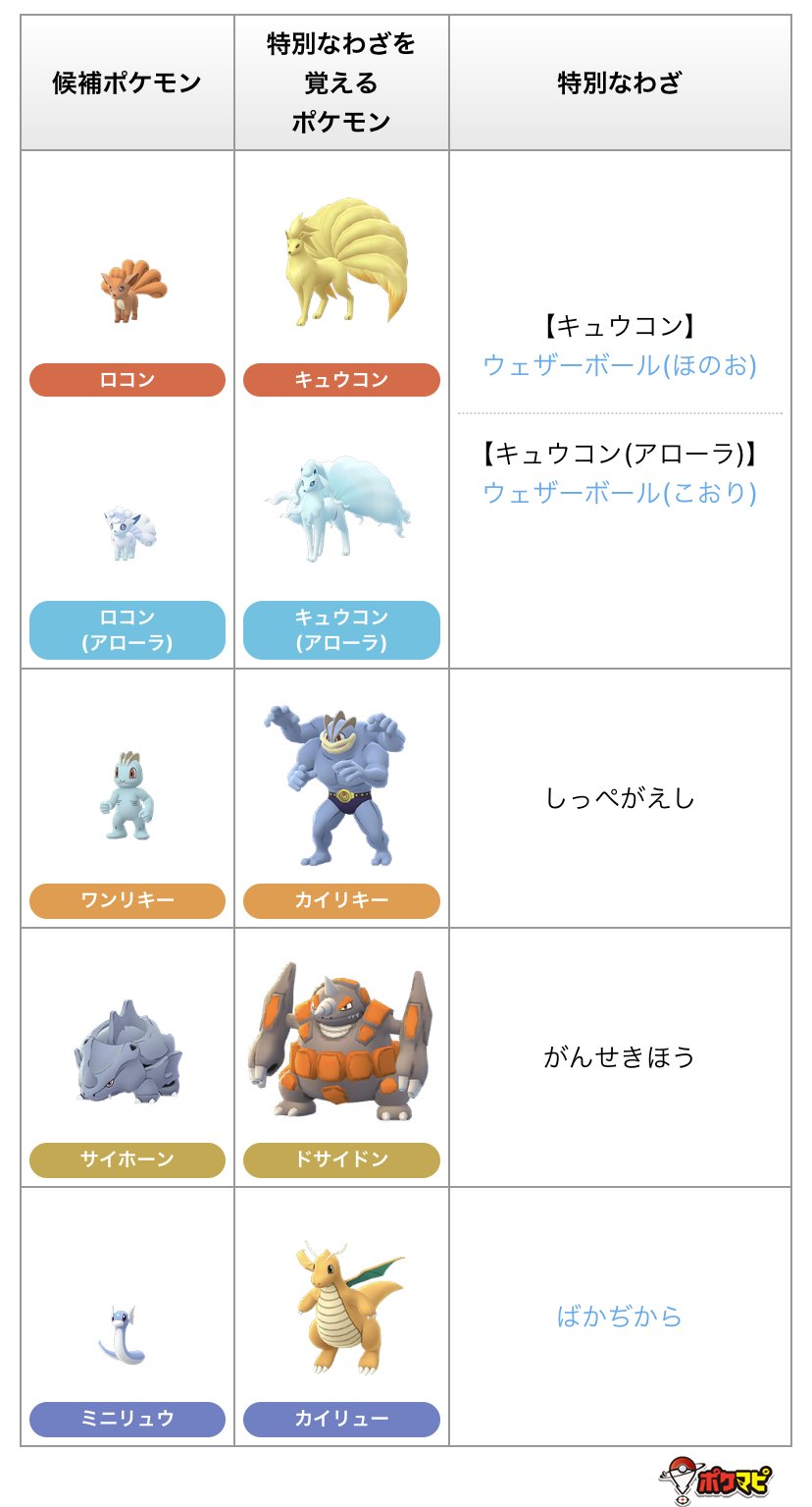 ポケモンgo攻略情報 ポケマピ 2月のコミュニティデイの候補である特別な技を図鑑やツールに追加しました キュウコン 通常 アローラ ウェザーボール ほのお こおり カイリュー ばかぢから その他の技は 詳細がわかり次第追加します 図鑑